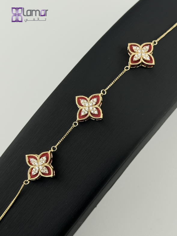 تألقي بإطلالة فريدة تعكس أناقتكِ الراقية مع سوار ذهب عيار 18 نجمة لامار المصنوعة من ذهب عيار 18، والمطَعّمة بحجر أحمر طبيعي يضفي لمسة من السحر والجاذبية.